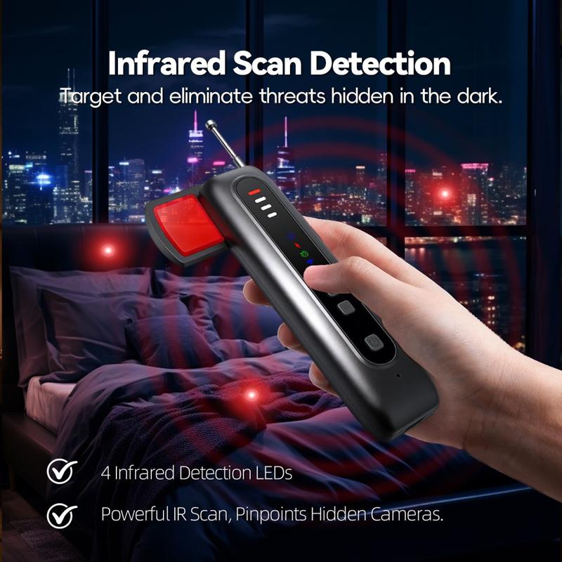 Mithilfe fortschrittlicher Scan-Technologie mit Infraroterkennung, WLAN-Signalüberwachung und Magnetsensorik kann das Gerät potenzielle Überwachungsgeräte schnell identifizieren. Die integrierten LED-Infrarotstrahler helfen dabei, Kameras auch in dunklen Umgebungen aufzuspüren, während einstellbare Empfindlichkeitsstufen es Ihnen ermöglichen, die Scan-Stärke an unterschiedliche Umgebungen anzupassen. Mit akustischen Alarmen und LED-Anzeigen warnt Sie der T07 sofort, wenn ein potenzielles Gerät entdeckt wird.