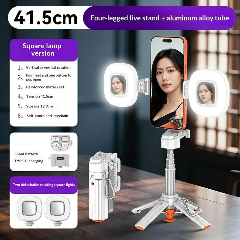 Die automatisch ausklappbaren Stativbeine sorgen beim Aufstellen für schnelle Stabilität, während das ausziehbare Design und die drehbare Handyhalterung den Wechsel zwischen verschiedenen Aufnahmewinkeln und Formaten erleichtern. Die mitgelieferte Bluetooth-Fernbedienung ermöglicht freihändiges Fotografieren, und die beiden quadratischen Aufhellleuchten sorgen für zusätzliche Helligkeit bei Selfies, Videoanrufen und Aufnahmen.