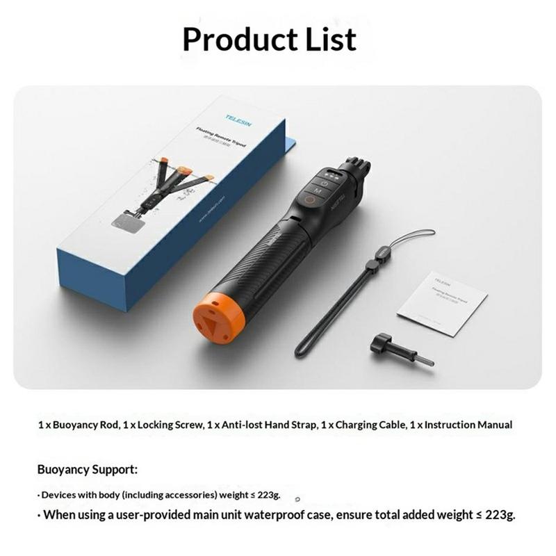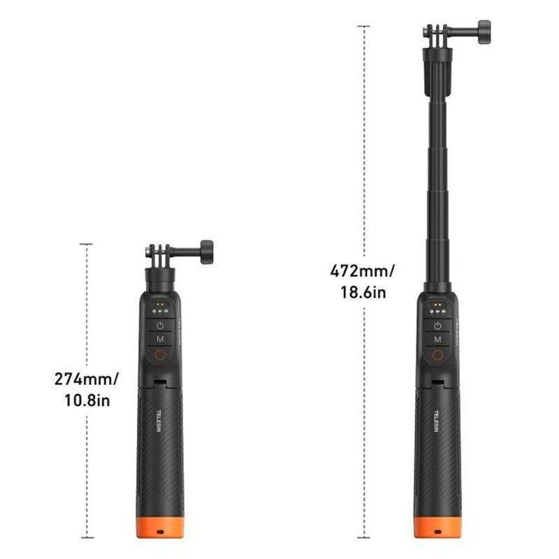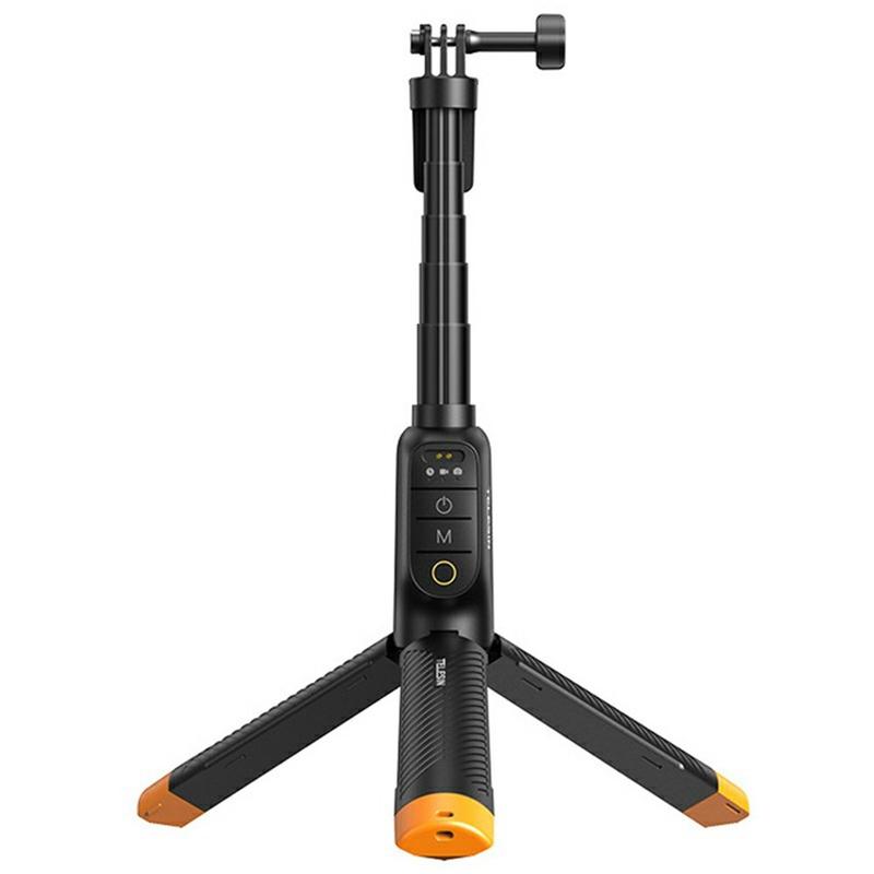 Die integrierte Bluetooth-Fernbedienung sorgt für zusätzlichen Komfort durch die drahtlose Kamerasteuerung, und die integrierte Stativfunktion erleichtert das Aufstellen des Sticks für stabilere Aufnahmen ohne Hände. Mit seinem kompakten, zusammenklappbaren Design, dem geringen Stromverbrauch und einer Betriebsdauer von bis zu 10 Stunden ist der Telesin S1-TSS-07 eine praktische Wahl für Kreative, die einen vielseitigen Action-Kamera-Griff für nasse und trockene Umgebungen suchen.