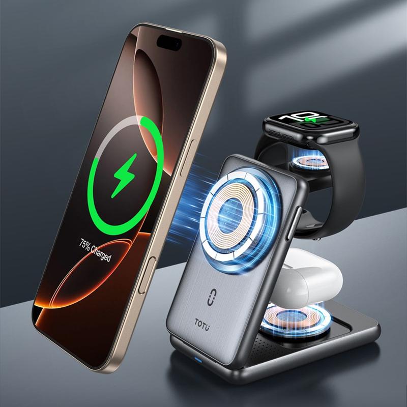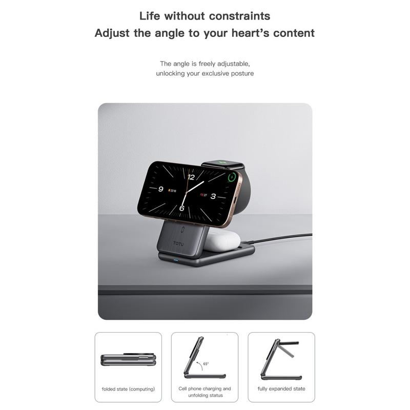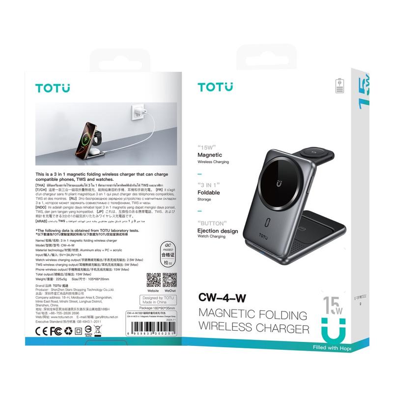 Das TOTU CW-4-W macht mehrere Ladegeräte überflüssig, denn es vereint alles, was Sie brauchen, in einem einzigen Gerät. Sein kompaktes, faltbares Design macht es ideal für Reisen, während schnelles kabelloses Laden sicherstellt, dass Sie nicht warten müssen. Die erstklassige Verarbeitungsqualität garantiert Langlebigkeit und Stil und macht es zu einer zuverlässigen Wahl für moderne Nutzer.