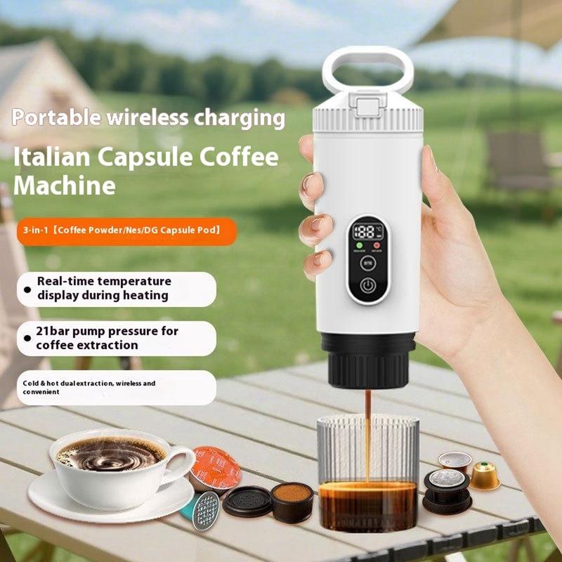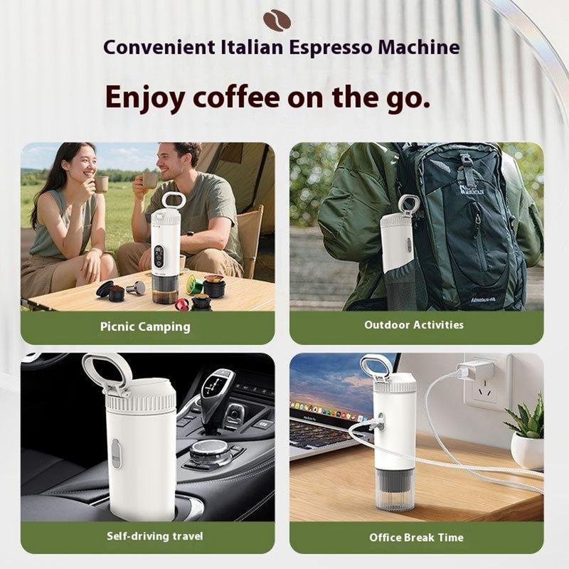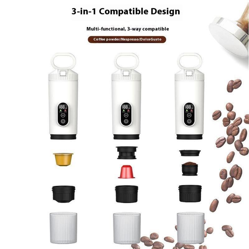 • 3-in-1 tragbare Espressomaschine - Kabellose elektrische Kapsel-Kaffeemaschine mit 7500mAh Akku für Auto, Haus & Outdoor - Kompatibel mit Nespresso, DolceGusto Kapseln, Kaffeepulver