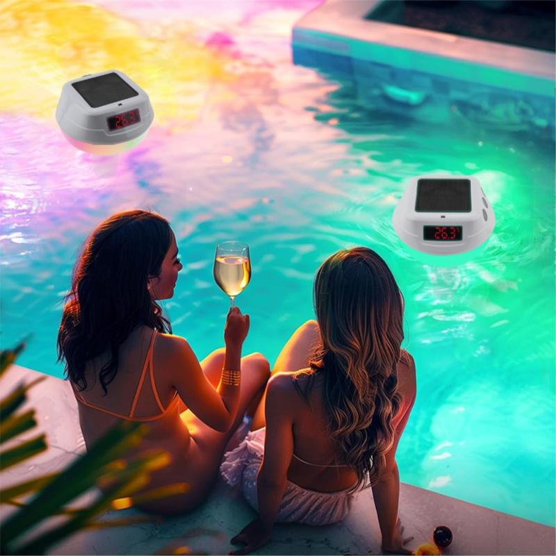 Überwachen Sie den Komfort Ihres Pools Tag und Nacht mit einem schwimmenden, solarbetriebenen Messgerät, das die Wassertemperatur und die lebendige RGB-Beleuchtung in Echtzeit auf ein bis zu 100 m entferntes Display im Innenbereich überträgt.