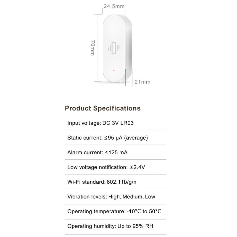 Dieser Sensor benötigt eine stabile 2,4-GHz-WiFi-Verbindung und eine AAA-Batterie (nicht im Lieferumfang enthalten). Um optimale Ergebnisse zu erzielen, befestigen Sie ihn fest an der zu überwachenden Oberfläche und testen Sie die Empfindlichkeitseinstellungen, um Fehlalarme zu vermeiden.