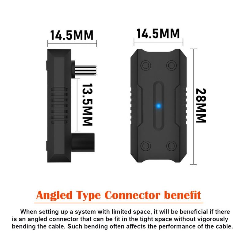 Der abgewinkelte Typ ermöglicht den Anschluss an einen weiblichen Port, auch wenn der Platz um den Port herum begrenzt ist