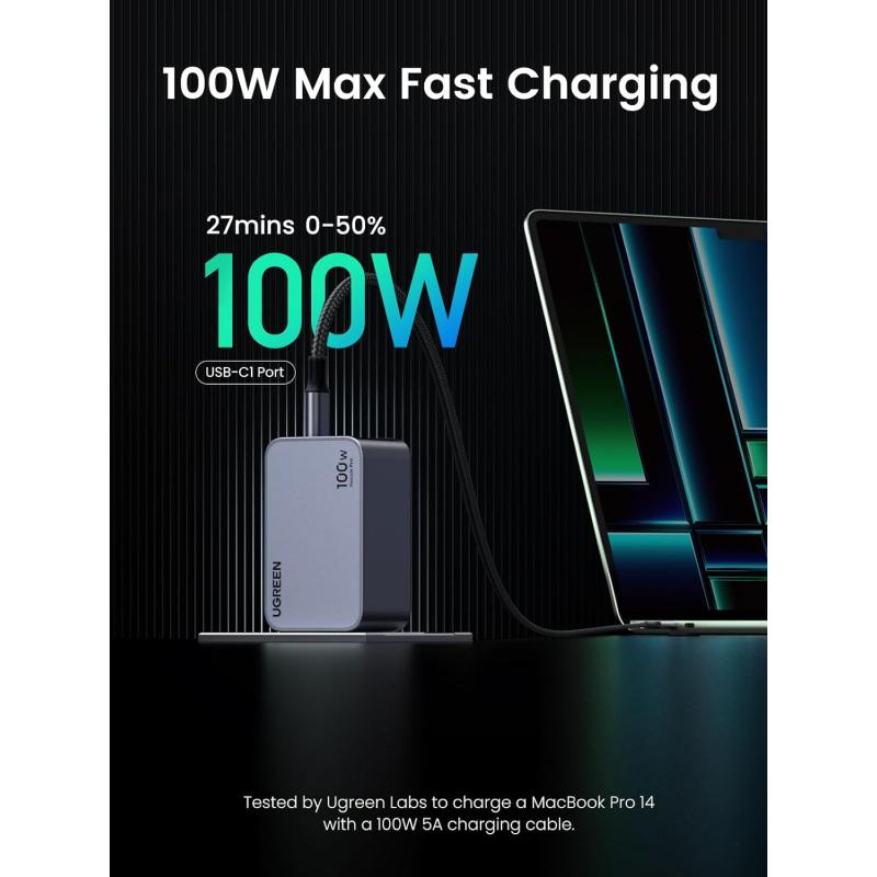 Laden Sie Ihre Geräte schnell und effizient mit dem UGREEN 100W Nexode Pro auf - kompakt, leistungsstark und so konzipiert, dass Sie immer in Verbindung bleiben, egal wo Sie sind.