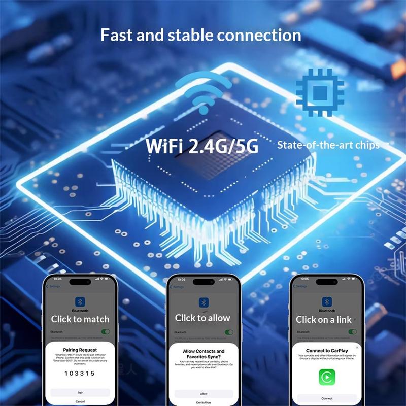 Der Ultra K15 unterstützt sowohl iPhone- als auch Android-Geräte innerhalb des angegebenen Kompatibilitätsbereichs und nutzt Bluetooth 5.2 sowie Dualband-WLAN 2,4 GHz/5 GHz für die drahtlose Verbindung. Den bereitgestellten Informationen zufolge lässt sich die Kopplung des Smartphones in drei Schritten abschließen, und der Adapter stellt die Verbindung nach dem Starten des Fahrzeugs innerhalb von etwa 5 bis 15 Sekunden automatisch wieder her. Dies sorgt für mehr Komfort im Alltag, hält den Armaturenbrettbereich aufgeräumter und reduziert Kabelsalat.