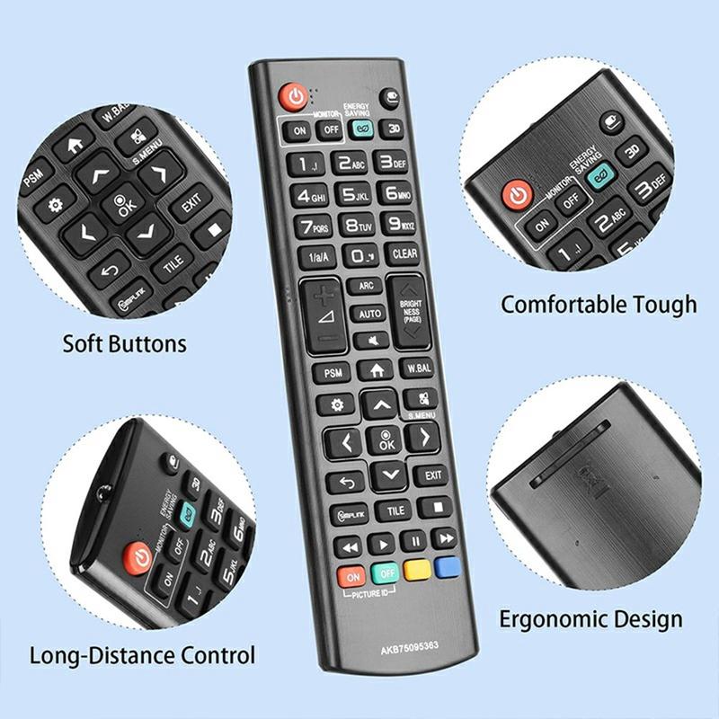 Diese Fernbedienung AKB75095363 ist der ideale Ersatz für Ihre LG TV-Fernbedienung - einfach einzurichten, langlebig und zuverlässig. Egal, ob Ihre Originalfernbedienung verloren gegangen, kaputt oder einfach abgenutzt ist, dieser Ersatz stellt die volle Funktionalität ohne Probleme wieder her.