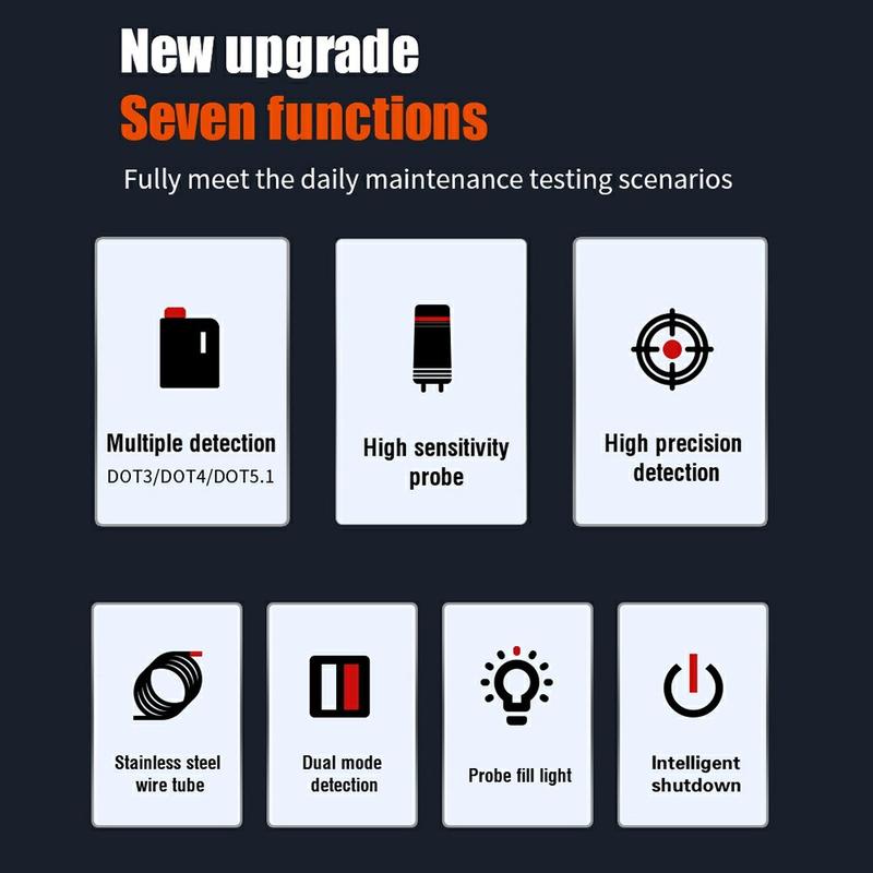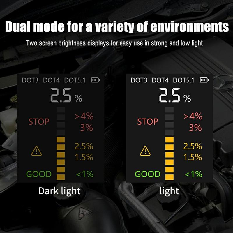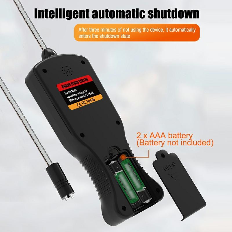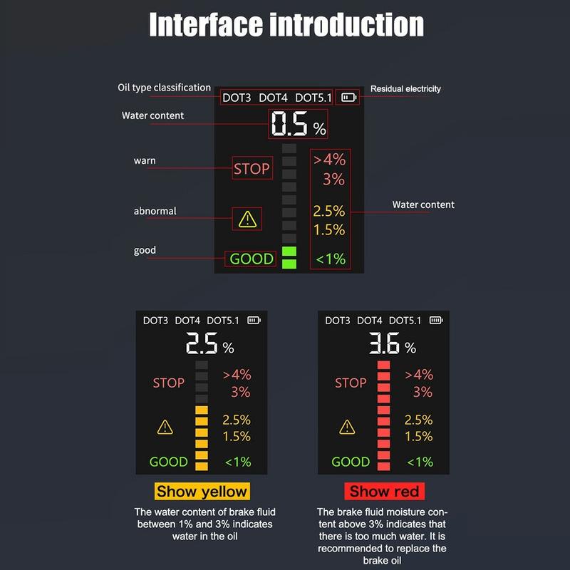 - Schnelle, genaue Überprüfung des Wassergehalts von DOT3, DOT4 und DOT5.1 Bremsflüssigkeiten