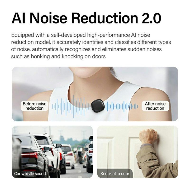 Das drahtlose Mini-Lavaliermikrofon V36 verwendet eine fortschrittliche AI-gesteuerte Geräuschunterdrückung mit drei Modi: High-Fidelity (grünes Licht), AI Noise Reduction (Standard, gelbes Licht) und DSP Noise Reduction. So wird sichergestellt, dass Ihre Aufnahmen frei von unerwünschten Hintergrundgeräuschen sind und Ihre Stimme natürlich und klar bleibt - perfekt für Vlogs, Interviews, Live-Streams und Podcasts.