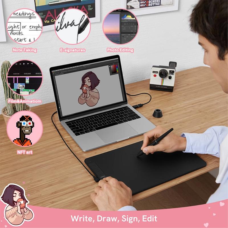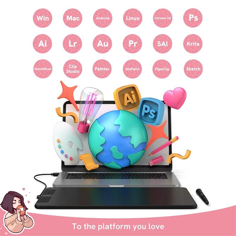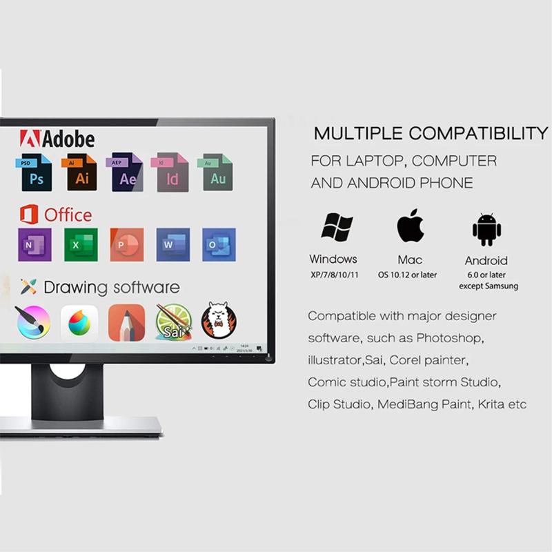 Kompatibel mit Ihren bevorzugten Plattformen: Das digitale Stifttablett VK1060 ist mit Windows 11/10/8/7, macOS 10.12 oder höher, Linux, Chrome OS 88 oder höher und Android 6.0 oder höher (außer Samsung) über OTG-Anschlüsse kompatibel. Es kann mit den meisten Kreativprogrammen verwendet werden, einschließlich Photoshop, Krita, Illustrator, SAI, SketchBook Pro, Fire Alpaca, Open Canvas, Manga Studio, ibisPaint, Medibang und mehr.