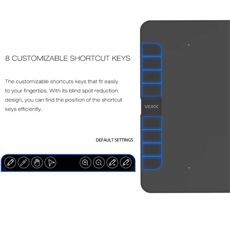 Ultra-effizientes Zeichentablett: Das VK1060 Zeichentablett ist mit 8 anpassbaren Schnelltasten ausgestattet. Sein Design minimiert die blinden Flecken, sodass Sie Ihre Tastenkombinationen schnell finden können. Sie können Ihre bevorzugten Tastenkombinationen programmieren, wie z. B. Vergrößern/Verkleinern, Pinselgrößenanpassung, Rückgängig machen usw., um die Effizienz zu steigern und einen äußerst ergonomischen und bequemen Arbeitsbereich zu schaffen.