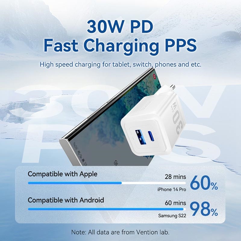 - Dual-Port-Ausgang: USB-C (30 W PPS / PD 3.0) und USB-A (30 W QC 4.0 / QC 3.0) für Telefone, Tablets und Ohrhörer