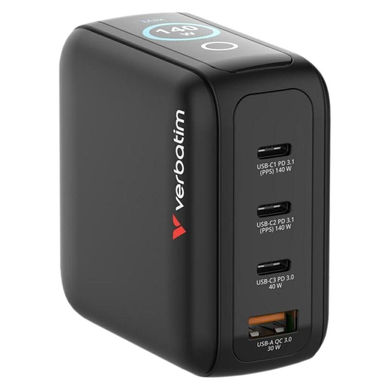 Verbatim Mini-GaN-Wandladegerät 140W mit Touchscreen-Display - 3xUSB-C + 1xUSB-A - EU-/UK-/US-Steckeraufsätze