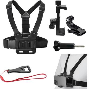 • Actionkamera-Brustgurtbefestigung - Verstellbarer Gurt mit drehbarer Handyhalterung, J-Base und Schraubenschlüssel