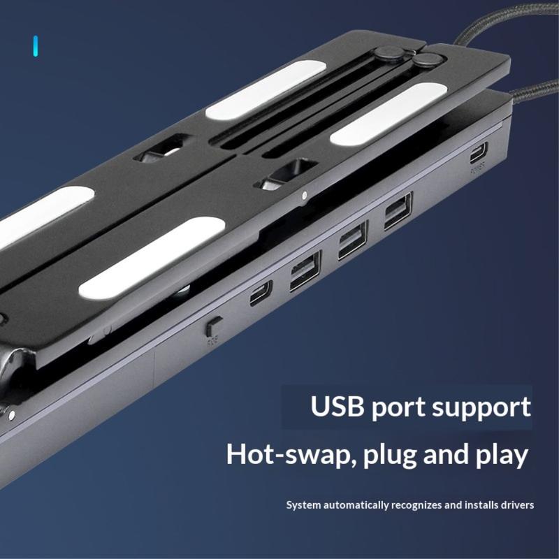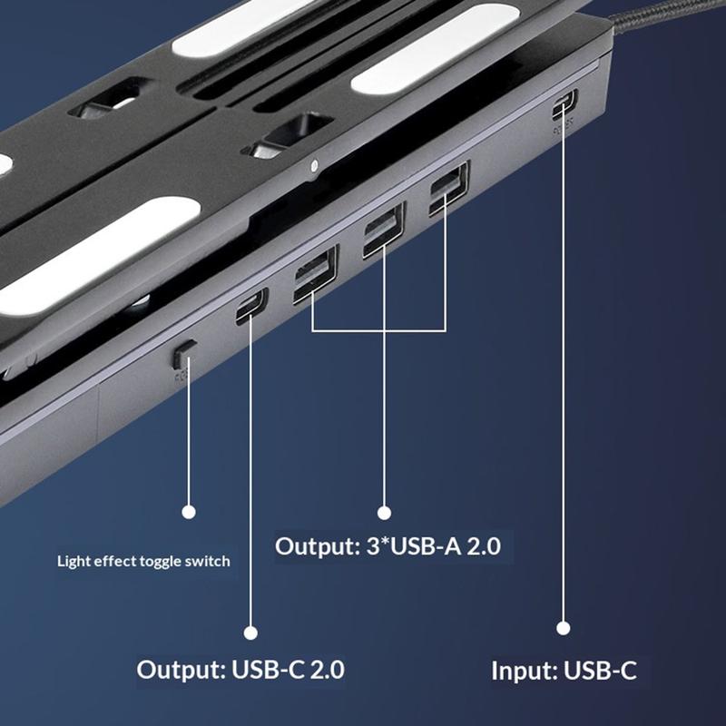 Der integrierte USB-Hub verfügt über 4 Anschlüsse: 3 × USB-A 2.0 und 1 × USB-C 2.0. Er unterstützt Hot-Swapping und Plug-and-Play, sodass Sie Peripheriegeräte wie eine Maus, eine Tastatur, ein USB-Laufwerk oder ein Ladekabel direkt über den Standfuß anschließen können.