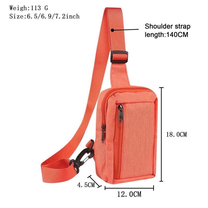 Mit dieser Brust- und Schultertasche aus wasserfestem Nylon können Sie Ihr Handy und andere wichtige Dinge bequem transportieren. Sie eignet sich für den Freizeitgebrauch oder für Reisen und bietet Schutz und Stil für Handys bis zu 7,2 Zoll. Der verstellbare Trageriemen und das leichte Design sorgen für Komfort, während das strapazierfähige Nylonmaterial Ihre Habseligkeiten vor den Elementen schützt.