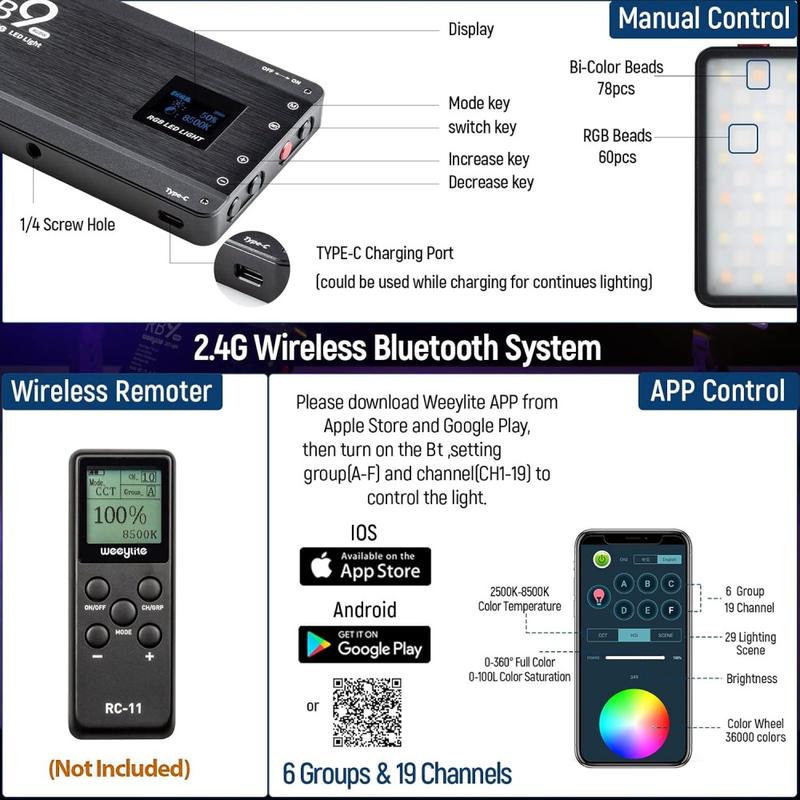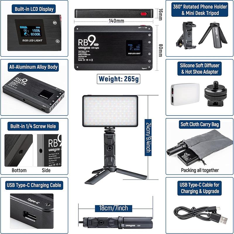 • Weeylite RB9 Tragbare RGB-Videoleuchte 2500-8500 K mit App-Steuerung