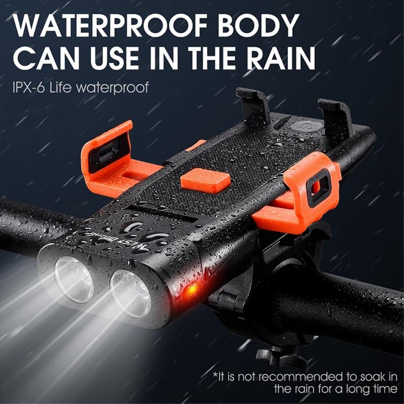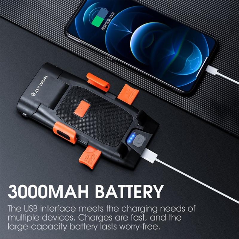 West Biking YP0701321 5-in-1 Fahrrad-Frontleuchte mit Telefonhalter, Powerbank-Funktion, Hupe, Warnlicht - 3000mAh, 4.5"-6.5"