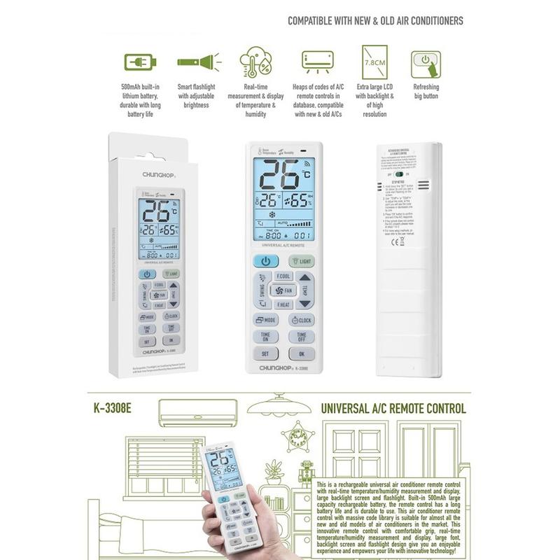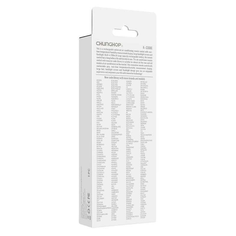 Übernehmen Sie die Kontrolle über Ihr Raumklima mit der CHUNGHOP K-3308E wiederaufladbaren Universal-Fernbedienung für Klimaanlagen. Sie ist für verschiedene Klimaanlagenmarken und -modelle geeignet und verfügt über einen eingebauten, wiederaufladbaren Akku, sodass Sie nicht ständig neue Batterien kaufen müssen. Die integrierte Temperatur- und Luftfeuchtigkeitsanzeige bietet Echtzeit-Updates und hilft Ihnen, jederzeit eine angenehme Umgebung aufrechtzuerhalten.