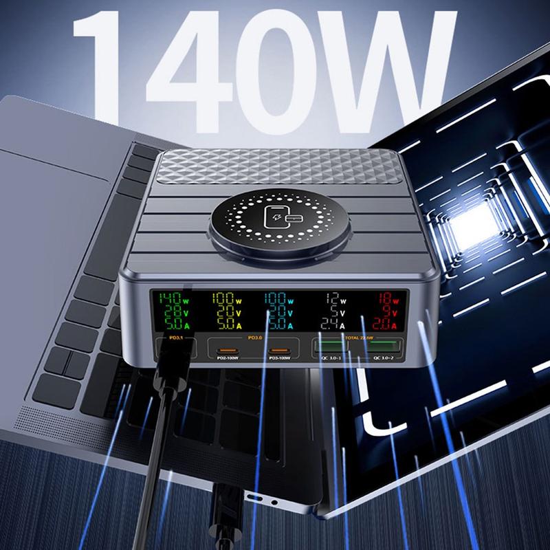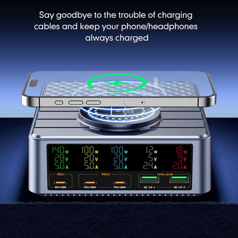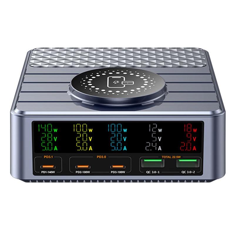 - Sechs Ladeanschlüsse: 2× PD, 3× QC, 1× kabelloses Ladepad