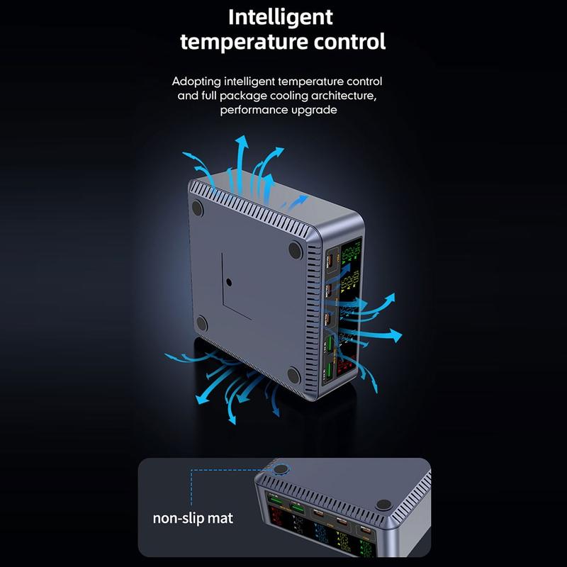 Die integrierte Digitalanzeige bietet Echtzeiteinblicke in die Ladeleistung und den Status der Anschlüsse und erleichtert die Überwachung der Stromverteilung. Mit seinem 9-fachen Sicherheitsschutz gewährleistet das Ladegerät einen sicheren und stabilen Betrieb für alle angeschlossenen elektronischen Geräte.