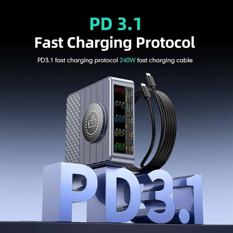 Das WLX-F2 bietet außergewöhnliche Leistung, moderne PD3.1-Unterstützung und vielseitige Anschlussoptionen in einem effizienten GaN-Tischladegerät. Es eignet sich perfekt für Benutzer mit mehreren Geräten mit hohem Bedarf, da es schnelleres Laden, verbesserte Wärmeregulierung und erhöhte Sicherheit bietet - und das alles in einem kompakten All-in-One-Ladehub.