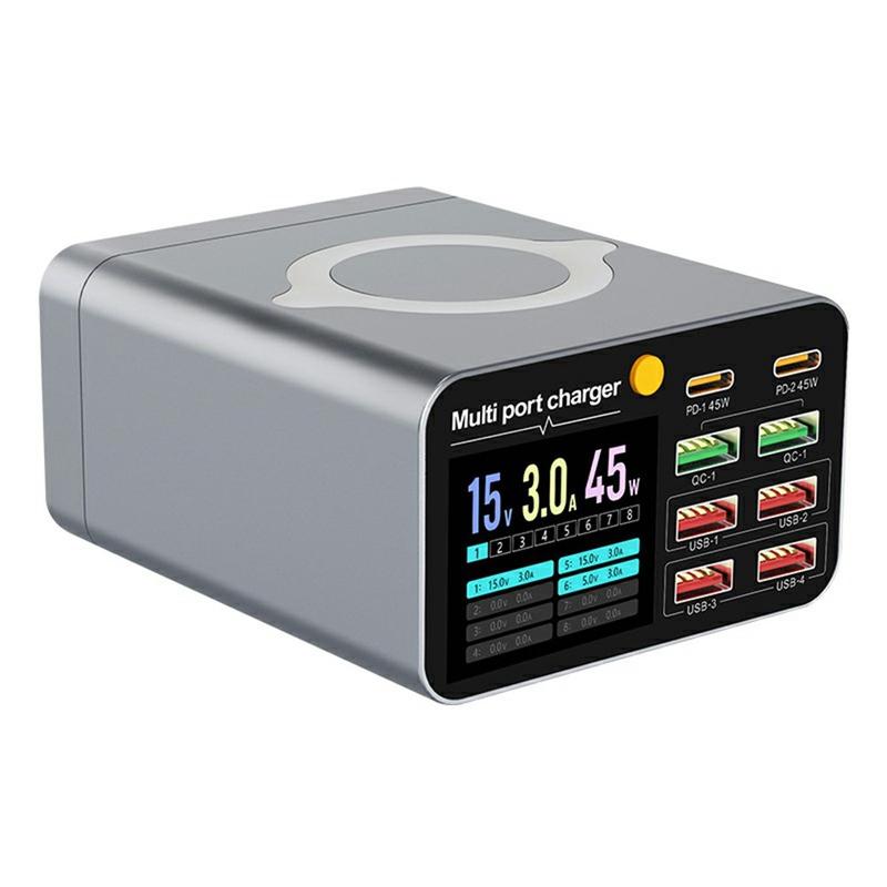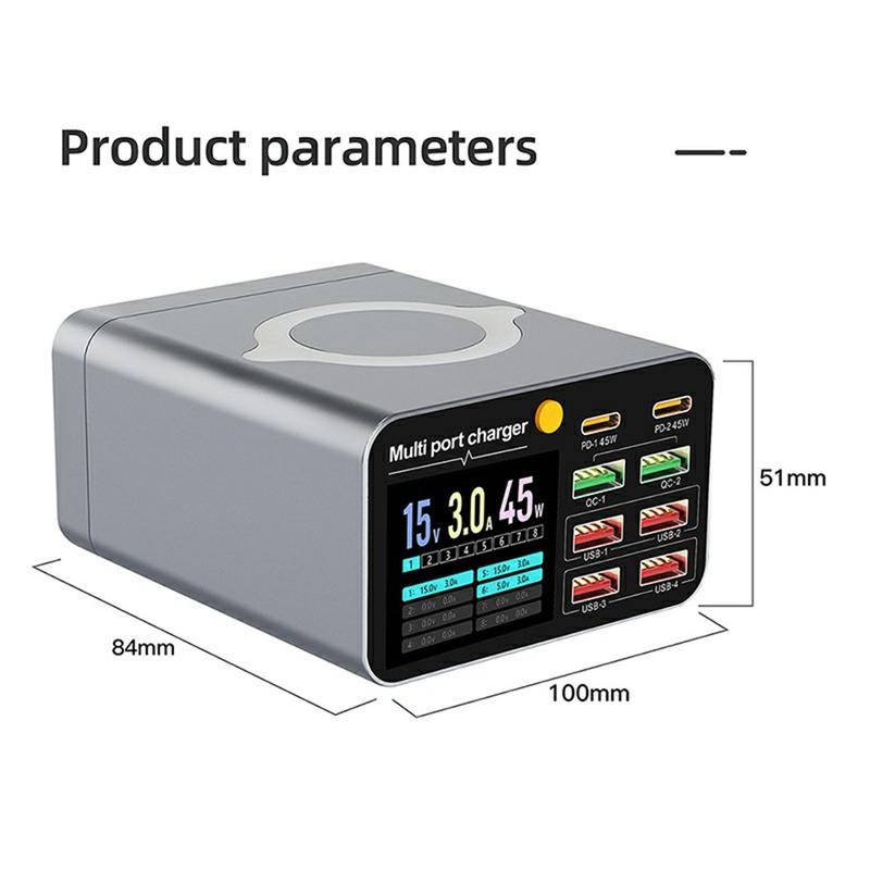 • WLX-M2 80W Desktop-Ladestation - 8-Port GaN Schnellladegerät mit USB-C PD & Wireless Charging (EU-Stecker)