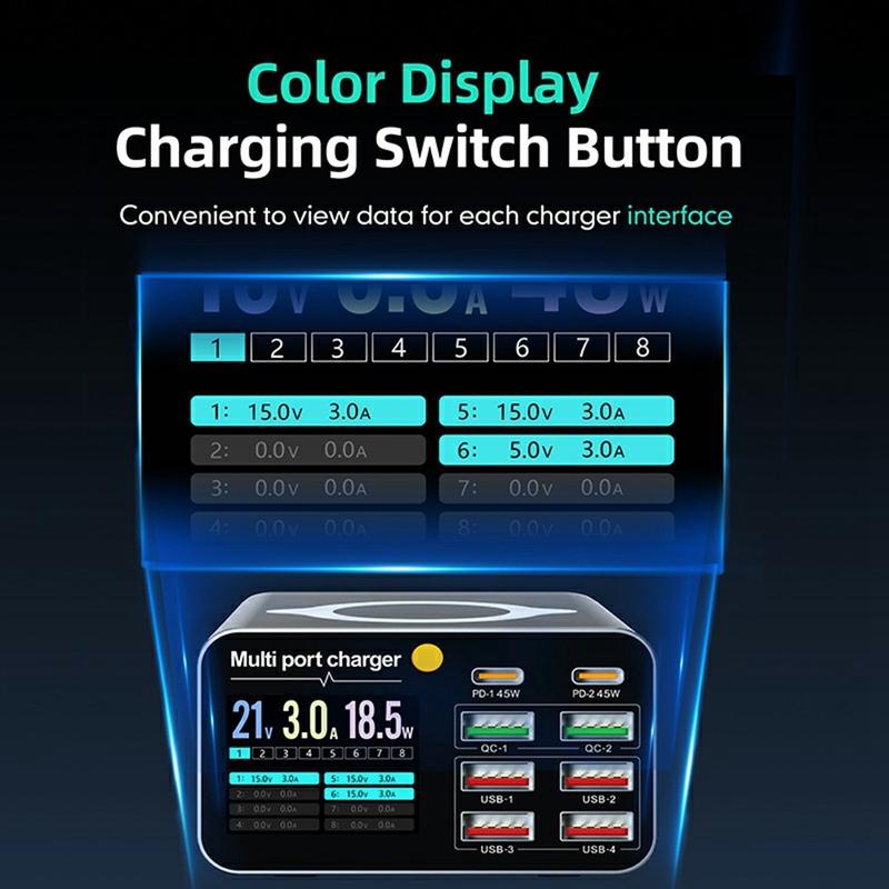 - Design mit 8 Anschlüssen: 2 × USB-C PD, 2 × QC, 4 × USB