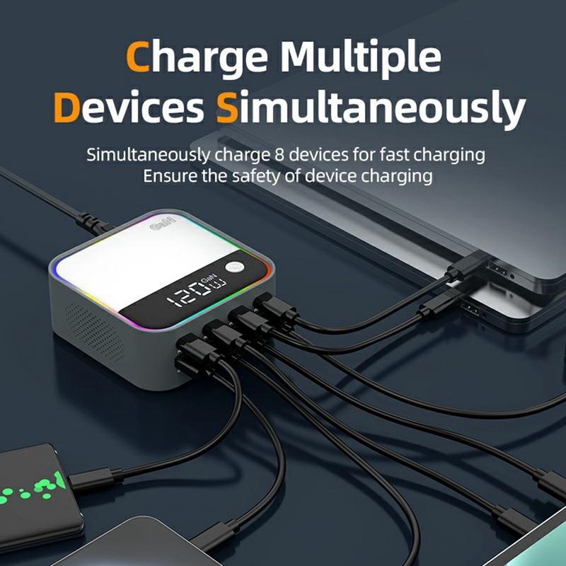 - 120W Multi-Geräteladung mit insgesamt 8 Anschlüssen (4 USB-C + 4 USB-A)