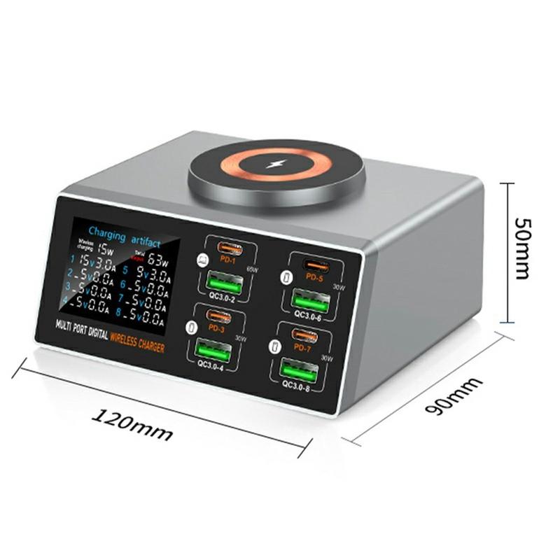 - 9-in-1-Ladehub mit 8 kabelgebundenen Anschlüssen + 1 kabelloses magnetisches Ladegerät
