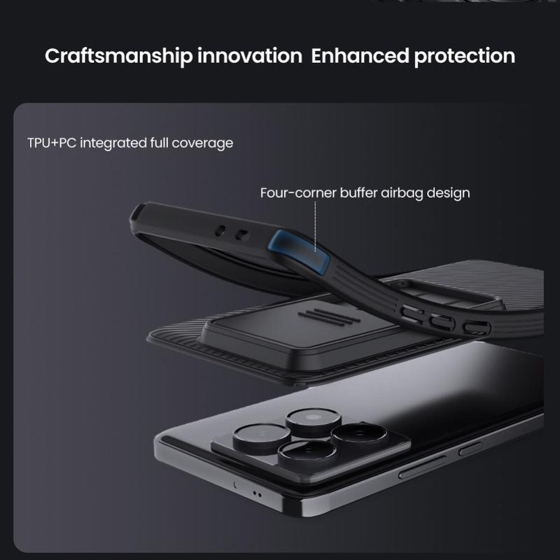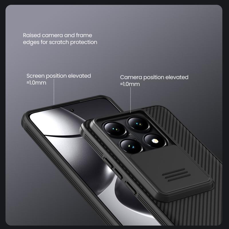 Genießen Sie zusätzliche Privatsphäre und Schutz mit der CamShield Pro-Hybridhülle von Nillkin. Durch die Kombination von starrem Kunststoff und TPU verhindert die Kameraabdeckung Kratzer und schützt gleichzeitig Ihr Xiaomi 14T Pro vor täglicher Abnutzung.
