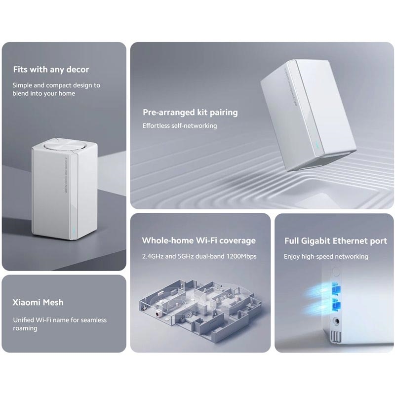 Das Xiaomi Mesh System AC1200 ist eine intelligente WLAN-Lösung für das ganze Haus, die für eine stabile, schnelle und nahtlose Internetabdeckung in Ihrem gesamten Zuhause entwickelt wurde. Mit Dualband-WLAN-Geschwindigkeiten von bis zu 1200 Mbit/s, vollständigen Gigabit-Ethernet-Anschlüssen und der Xiaomi Mesh-Technologie hilft es, Bereiche mit schwachem Signal zu beseitigen und sorgt für eine reibungslose Verbindung, wenn Sie sich von Raum zu Raum bewegen.