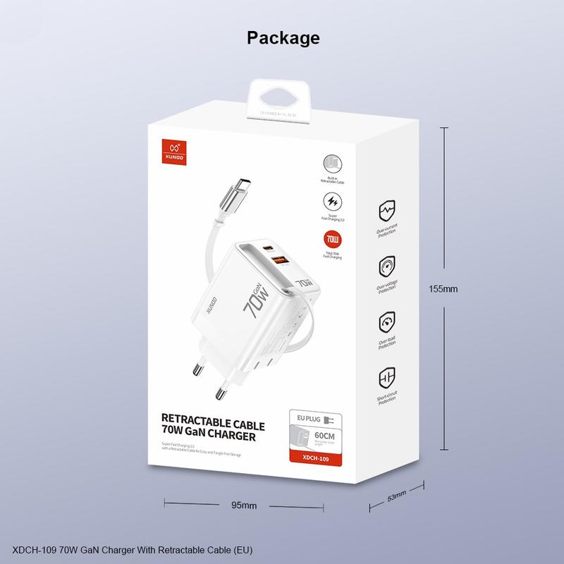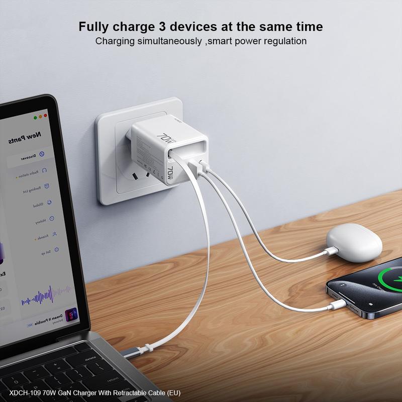 Xundd XDCH-109 70W GaN-Schnellladegerät - EU-Stecker, einziehbares 60 cm USB-C-Kabel & 3-Port-Stromadapter für Laptops, Tablets & Smartphones