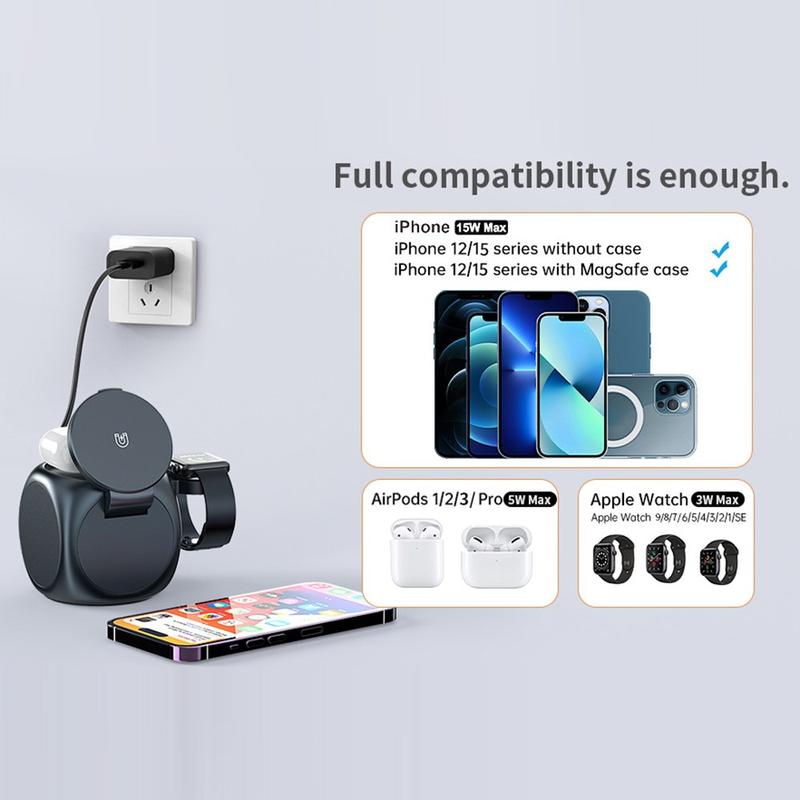 - 3-in-1 Magnetisches Laden - Bequemes gleichzeitiges Laden von iPhone, Apple Watch und AirPods mit einer kompakten und effizienten kabellosen Station.