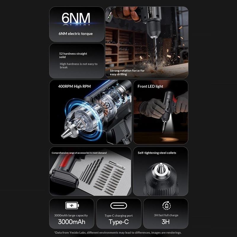 • Yesido EC36 Akku-Schrauber/Bohrmaschine, 3000mAh, mit 8 Nm Drehmoment, 400 U/min und LED-Licht