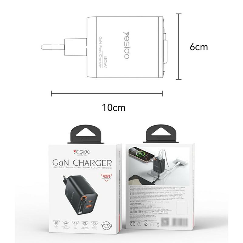 Yesido YC99 40W Schnell-Ladegerät mit einziehbarem Typ-C-Kabel - USB-A und USB-C GaN-Ladeadapter - EU-Stecker