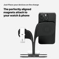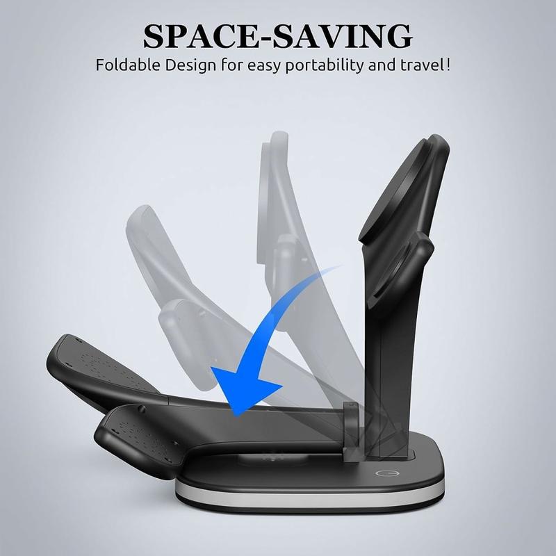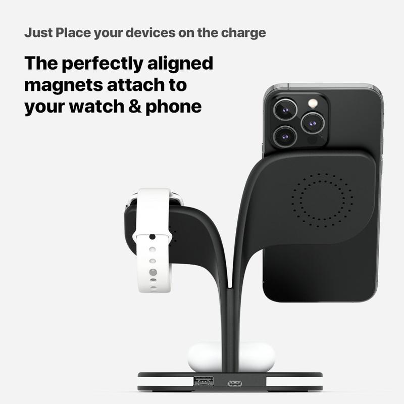 - Drahtloses 3-in-1-Laden: Ausgestattet mit zwei integrierten Ladepads, die mit MagSafe kompatibel sind, ermöglicht diese Station das gleichzeitige Aufladen von iPhone, Apple Watch und AirPods und vereinfacht so den Ladevorgang.