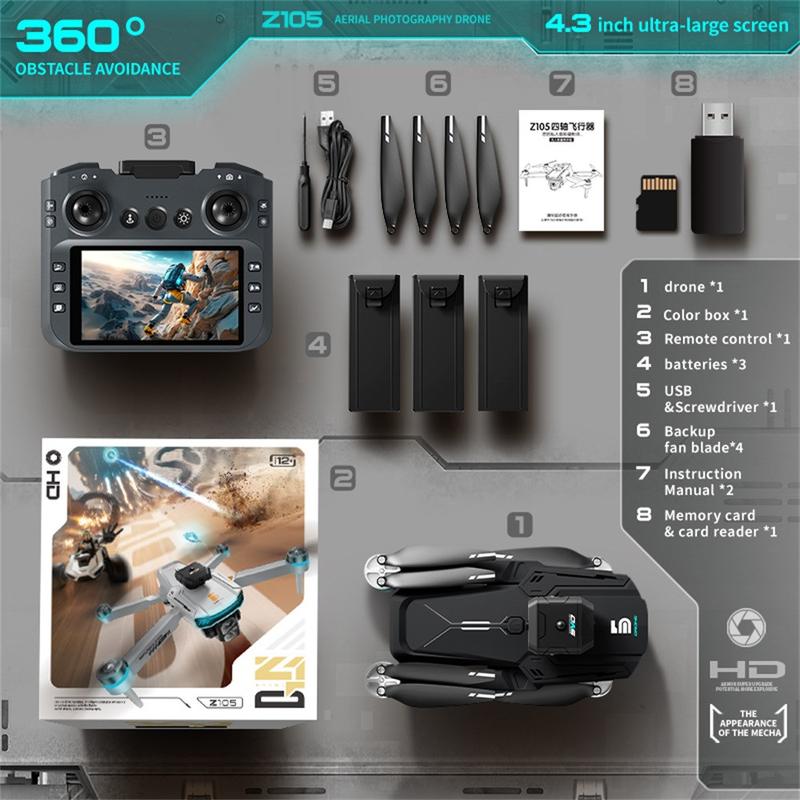 • Z105 Dual-Kamera Smart Drone mit 4.3" Display Controller & 3 Akkus - Bürstenloser Motor Hindernisvermeidung Quadcopter