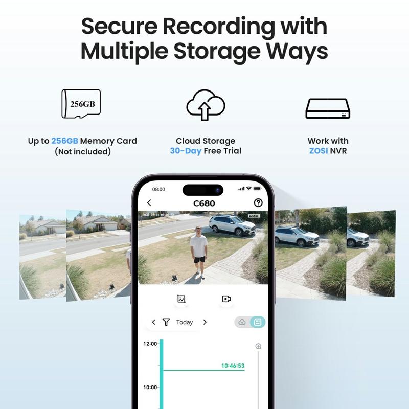 - Speicher: Unterstützt microSD-Karten mit bis zu 256 GB (nicht im Lieferumfang enthalten), Cloud-Speicher und ZOSI NVR-Integration